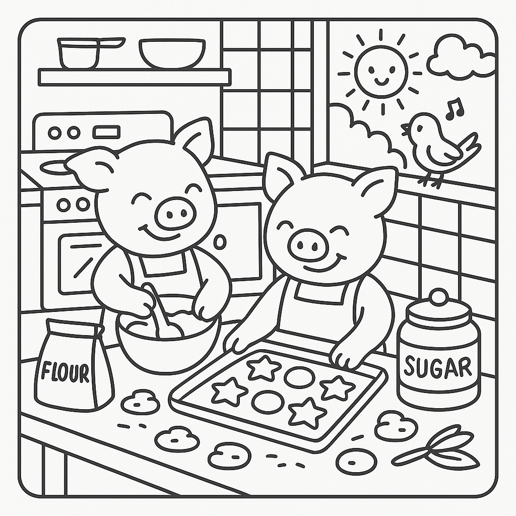 A missão dos porquinhos era preparar cookies deliciosos para todos os amigos que curtiram aquele dia especial. Tutu ficou responsável por mexer a massa dentro de uma tigela enorme, enquanto Lola, bem caprichosa, moldava os biscoitos em formatos de estrelas e bolinhas, colocando tudo na assadeira com muito cuidado.