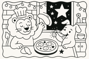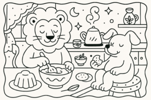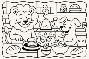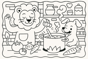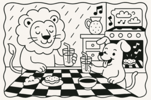 O Leão acordou com um ronco gigante na barriga. O Cachorro já pulava animado ...