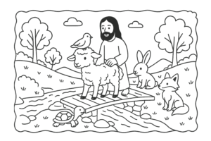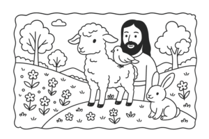 Jesus e seus amigos se encontraram em um campo florido. O cordeiro, com olhar ...