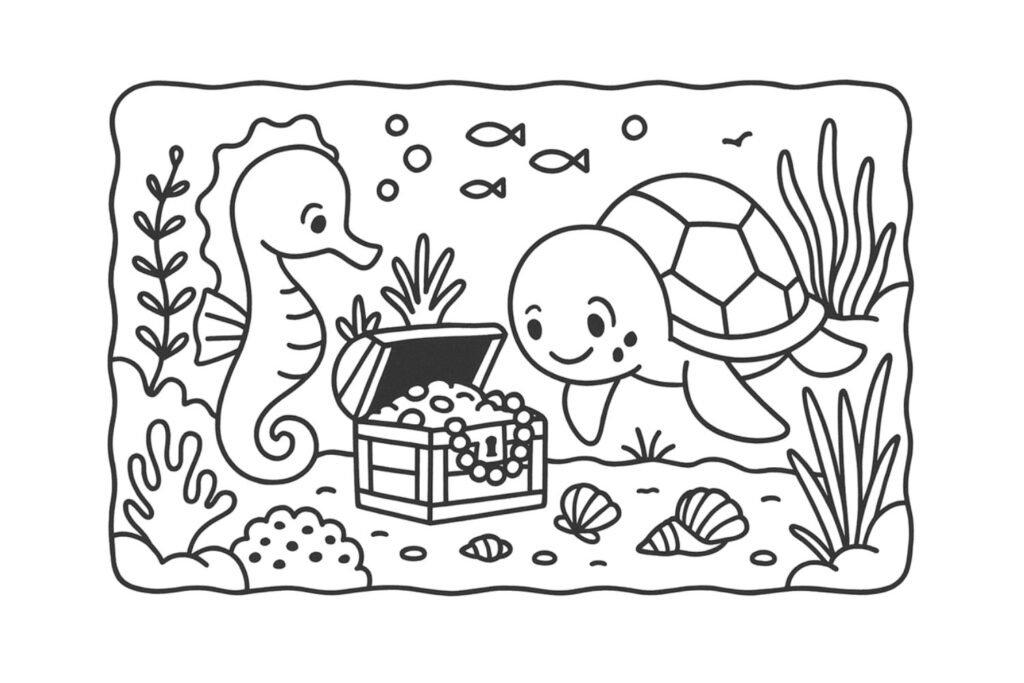 No recife, encontraram Siro, o cavalo-marinho sonhador, e Luma, a tartaruga tranquila. Juntos, acharam um baú antigo escondido entre as pedras. Dentro, moedas e pérolas brilhavam, mas para eles, o verdadeiro tesouro era a amizade.