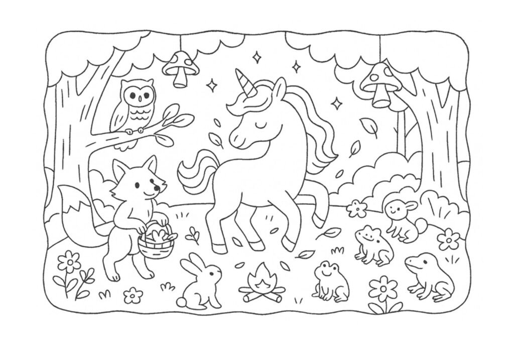 Luma, a raposa, chegou com sua cesta cheia de folhas encantadas. Nara, a coruja, trouxe histórias para contar em volta da árvore. E no centro da clareira, o unicórnio mágico espalhava sua luz suave, como se fosse um farol de calma e alegria.