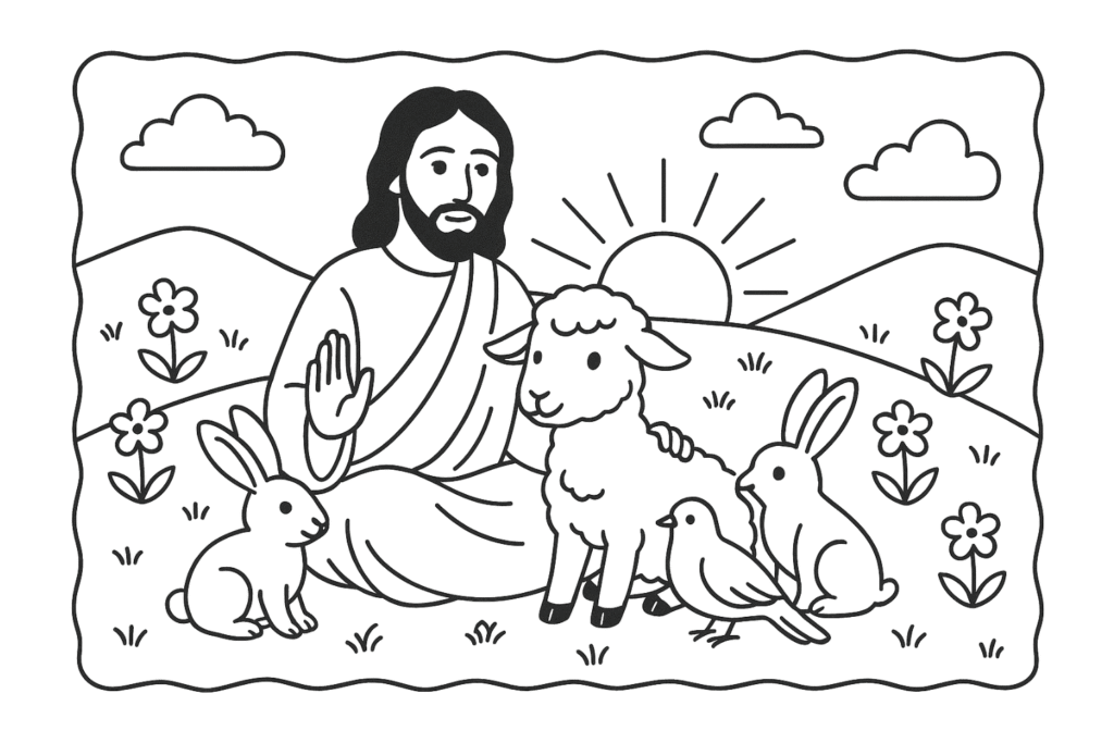 Jesus se levantou devagar e olhou para os amigos ainda adormecidos. A pomba respirava profundamente, a tartaruga ainda estava enrolada em sua concha, o coelho se mexia com sonhos suaves, e a raposa, desperta, observava em silêncio com os olhos brilhantes.