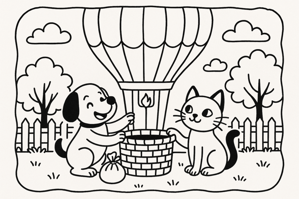 Era uma manhã ensolarada no quintal de Tito e Mimi. O céu estava limpinho, com nuvens fofas parecendo algodão-doce. Tito, um cachorrinho cheio de energia, corria de um lado pro outro organizando as últimas coisas para sua maior aventura. Já Mimi, a gatinha observadora e curiosa, examinava atentamente cada detalhe do enorme balão colorido que haviam construído juntos.