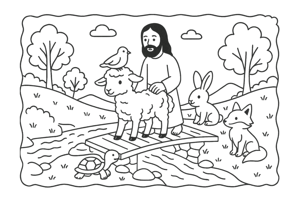 Jesus, o cordeiro, deu alguns passos à frente. Olhou para a ponte, depois para o grupo, e sorriu com ternura.