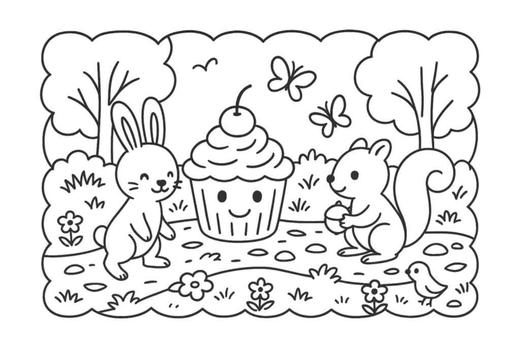 Depois do delicioso piquenique, o Cupcake feliz percebeu um detalhe curioso: um grupo de borboletas coloridas sobrevoava o campo, formando um pequeno corredor no ar.