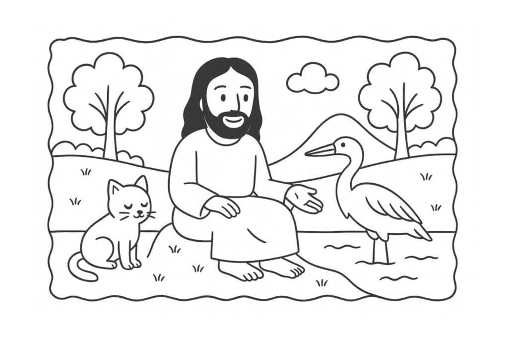 O dia estava sereno, e o Amigo Jesus escolheu um lugar à sombra para descansar. Ao seu lado, um gato permanecia tranquilo, com os olhos semicerrados, desfrutando da paz do momento. À frente, um pelicano alto e elegante permanecia na beira da água, atento a cada movimento do lago.
