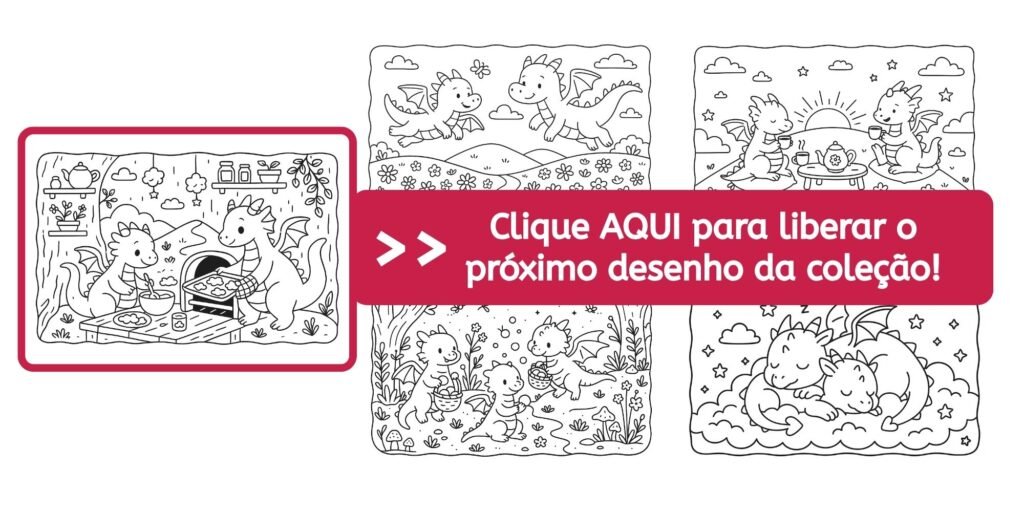 Os dragões fofos mexiam a massa com colheres de madeira e assavam biscoitos de nuvem num forno de pedra que soltava vapor perfumado. Ao redor, potes com geleias brilhantes e utensílios mágicos davam charme à cena.