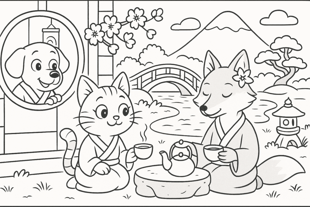 Sentados sob uma cerejeira florida, Akiko serviu o chá com movimentos graciosos e respeitosos. Mimi tentou imitar, mas acabou derramando um pouco, e todos riram com carinho.