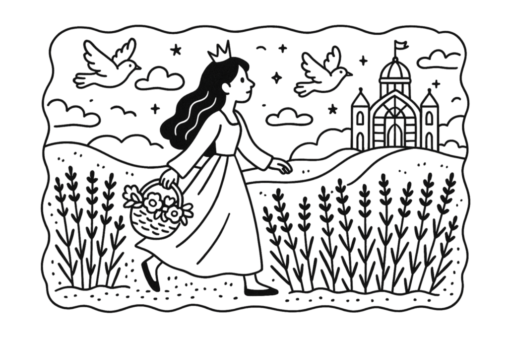 O caminho até o salão era cercado por campos de lavanda e riachos cintilantes, onde aves brancas pareciam guiá-la.