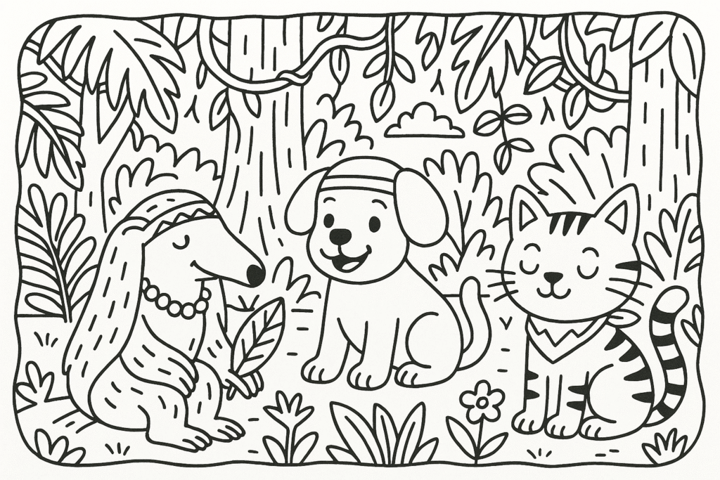 Depois de cruzarem nuvens fofinhas e uma tempestade de pétalas douradas, Tito e Mimi viram abaixo de si um tapete verde que parecia infinito. Era a Floresta Amazônica! Árvores altíssimas, rios que serpenteavam como cobras de cristal e sons de pássaros desconhecidos preenchiam o ar.