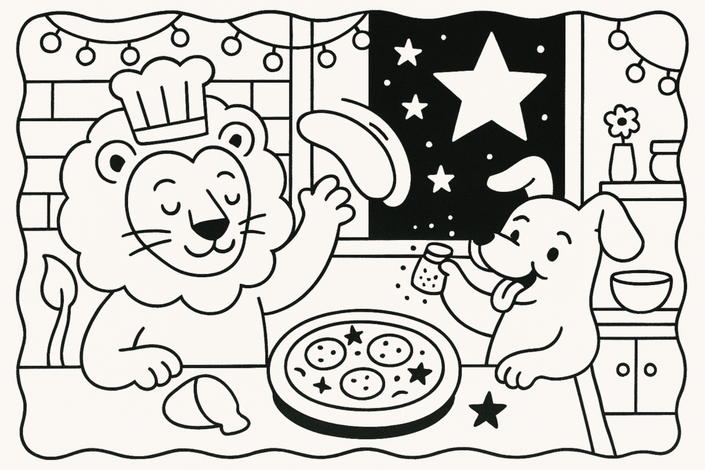 O Leão rodopiava a massa como um verdadeiro pizzaiolo, e o Cachorro fazia chover glitter comestível. Quando a pizza ficou pronta, uma estrela apareceu na janela e piscou para eles.