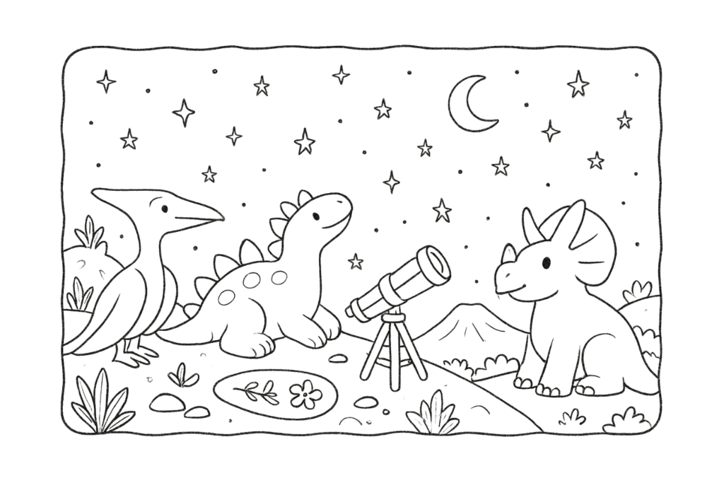 Eles levaram um telescópio artesanal, feito de bambu e cristais, e o posicionaram com cuidado no centro de um círculo de pedras brilhantes. Ptero usava sua visão apurada para localizar constelações, Estega desenhava as estrelas com um graveto na areia, e Tricerá ficava de olho nos meteoros que cruzavam o céu.
