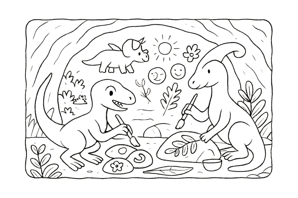 Enquanto isso, do lado de fora, pequenos dinossaurinhos curiosos espiavam e riam, deixando a tarde ainda mais divertida. Cada pincelada era um convite para relaxar, se expressar e brincar com a imaginação.