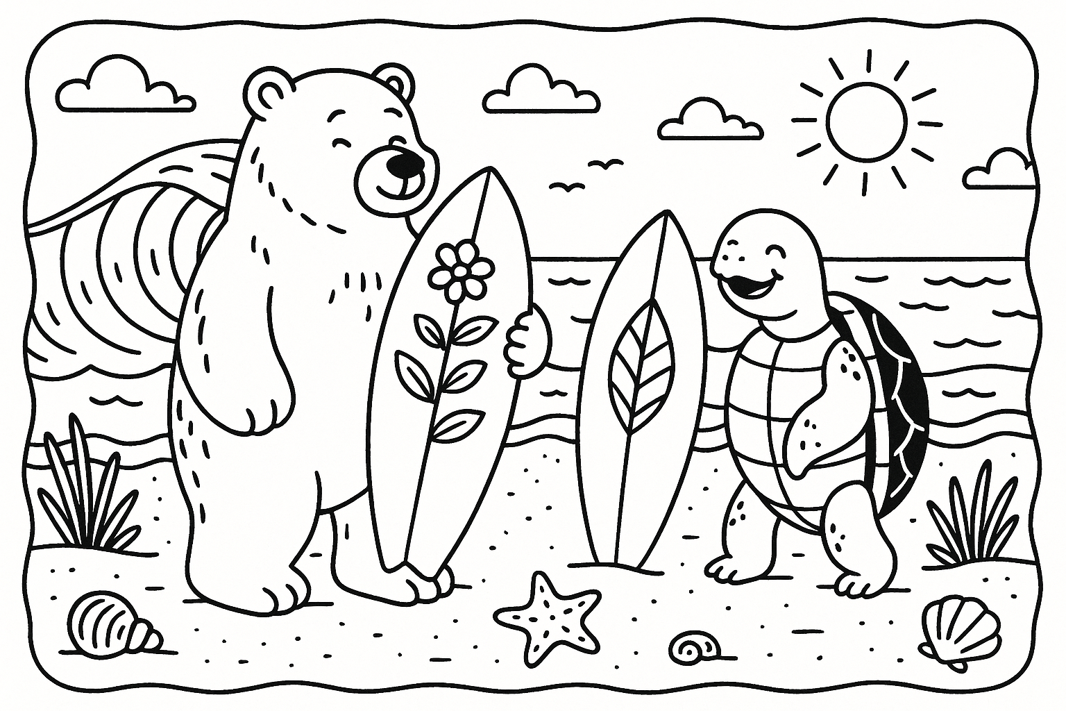 Entraram devagar na água, deixando que as ondas os embalassem. A tartaruga se equilibrou na prancha, devagar, enquanto o urso pegava impulso e deslizava como se fosse parte do mar.